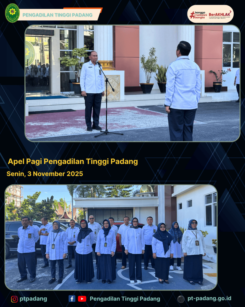 Pengadilan Tinggi Padang melaksanakan Apel Pagi rutin yang diikuti oleh seluruh pegawai, pejabat struktural, fungsional, serta pelaksana dan PPPK di lingkungan Pengadilan Tinggi Padang.