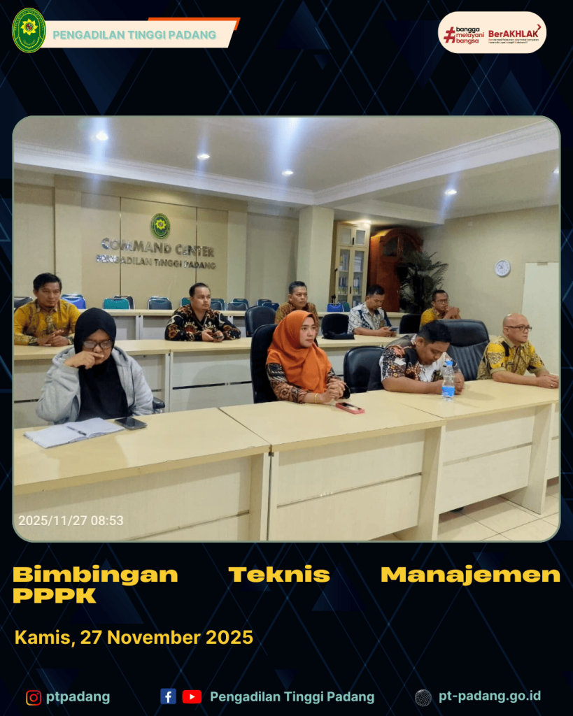 Kamis, 27 November 2025 — Bertempat di Command Center Pengadilan Tinggi Padang, Sub Bagian Kepegawaian dan PPPK mengikuti Bimbingan Teknis (Bimtek) Manajemen PPPK yang diselenggarakan secara daring.