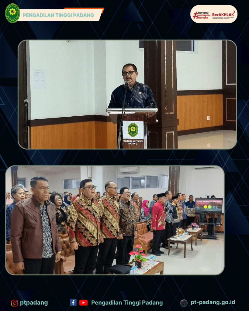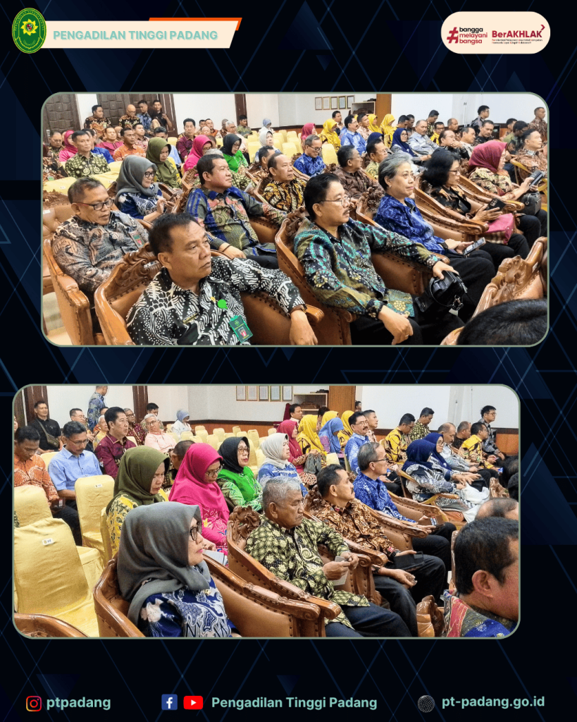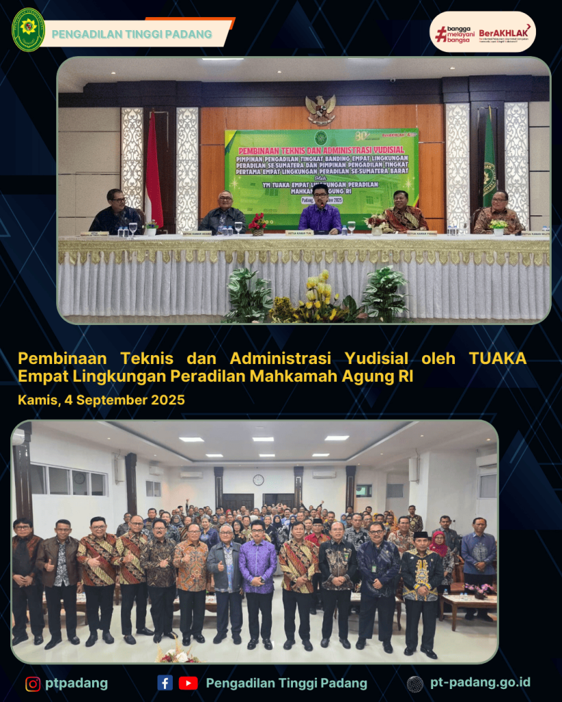 Bertempatkan di Ruang Sidang Utama Lantai II Pengadilan Tinggi Padang telah dilaksanakan Pembinaan Teknis dan Administrasi Yudisial Pimpinan Pengadilan Tingkat Banding Empat Lingkungan Peradilan Se-Sumatera dan Pimpinan Pengadilan Tingkat Pertama Empat Lingkungan Peradilan Se-Sumatera Barat oleh YM Tuaka Empat Lingkungan Peradilan Mahkamah Agung RI.