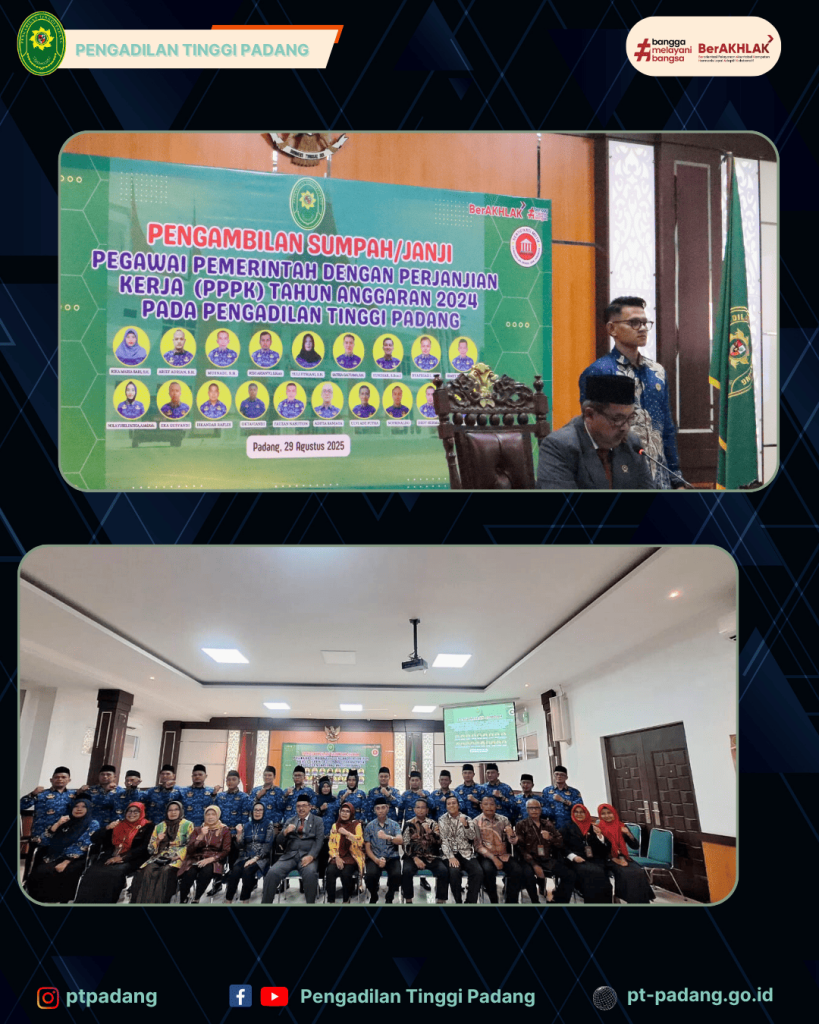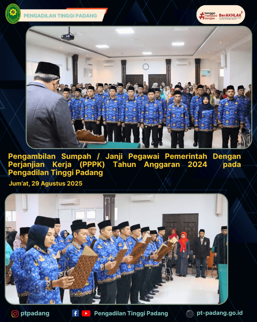 Bertempat di Ruang Sidang Utama Lantai II Pengadilan Tinggi Padang, Pengambilan Sumpah / Janji Pegawai Pemerintah Dengan Perjanjian Kerja (PPPK) Tahun Anggaran 2024 yang dipimping langsung oleh Ketua Pengadilan Tinggi Padang Bapak Dr. Budi Santoso, S.H., M.H.