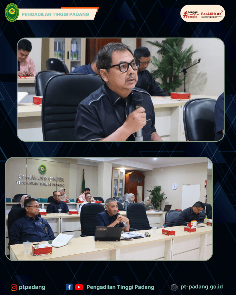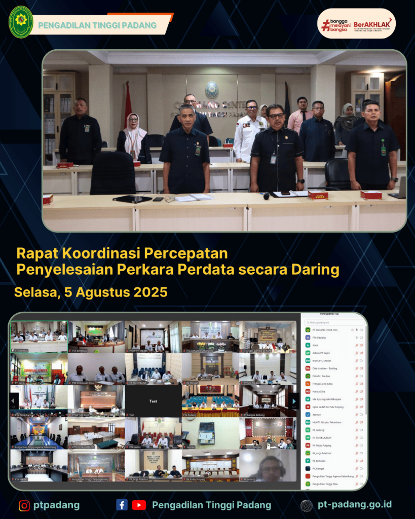 Betempatkan di Command Center Pengadilan Tinggi Padang. Direktorat Jenderal Badan Peradilan Umum telah menyelenggarakan Rapat Koordinasi Percepatan Penyelesaian Perkara Perdata bagi Pengadilan Negeri se-Wilayah Hukum Pengadilan Tinggi Padang.