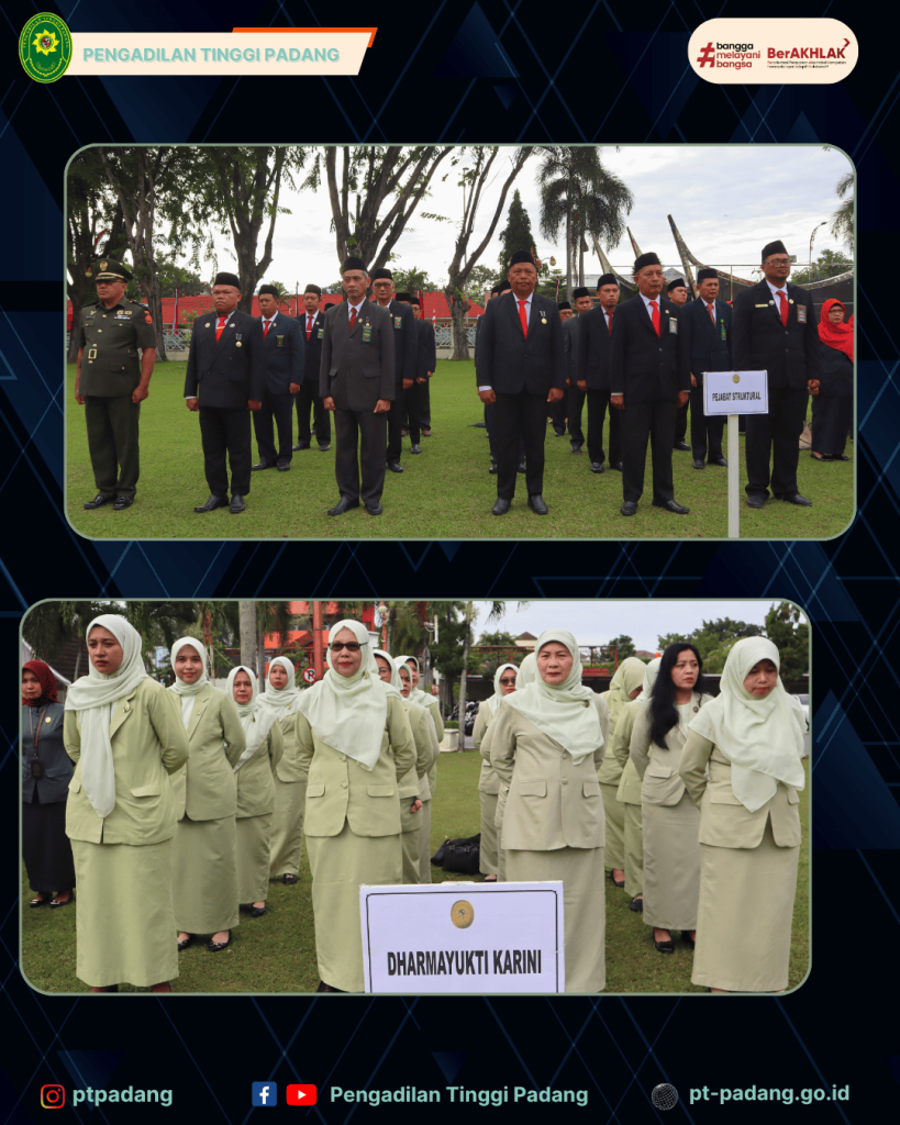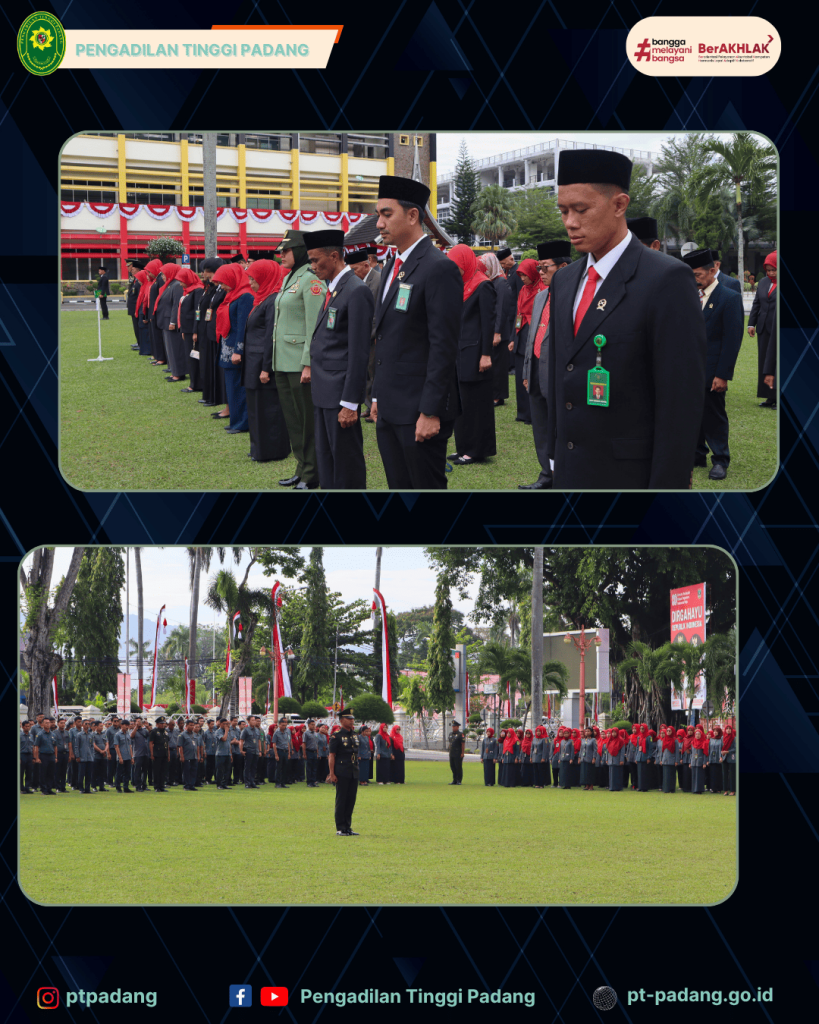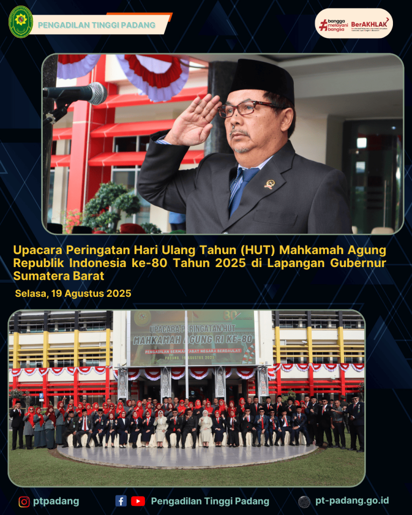 Telah dilaksanakan Upacara Peringatan Hari Ulang Tahun (HUT) Mahkamah Agung Republik Indonesia ke-80 Tahun 2025 di Halaman Kantor Gubernur Sumatera Barat. Upacara Peringatan Hari Ulang Tahun (HUT) Mahkamah Agung Republik Indonesia ini dipimpin oleh Ketua Pengadilan Tinggi Padang Bapak Dr. Budi Santoso, S.H., M.H.
